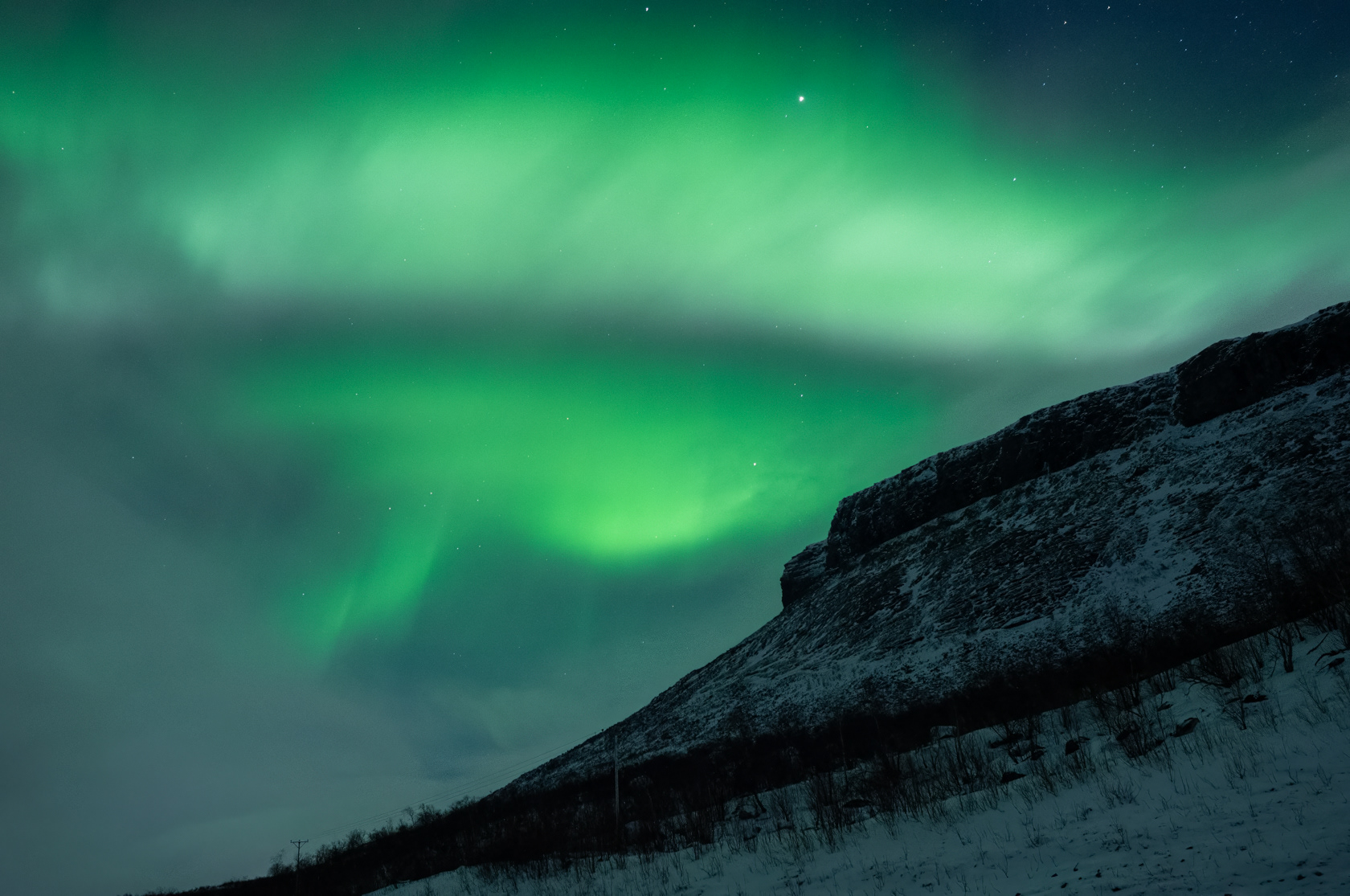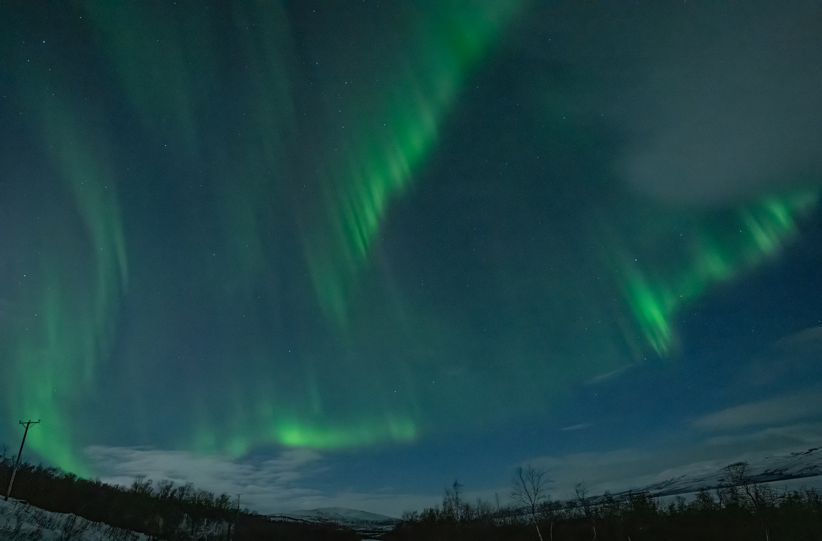 Norrskenet rörde sig väldigt fort över himlen så på sista bilden pressade jag ISO högt typ 16000. med full bländare sänkte det exponeringstiden från 4s till 0,6s, för att fånga strukturen bättre men tyvärr blir bilden mycket grynigare