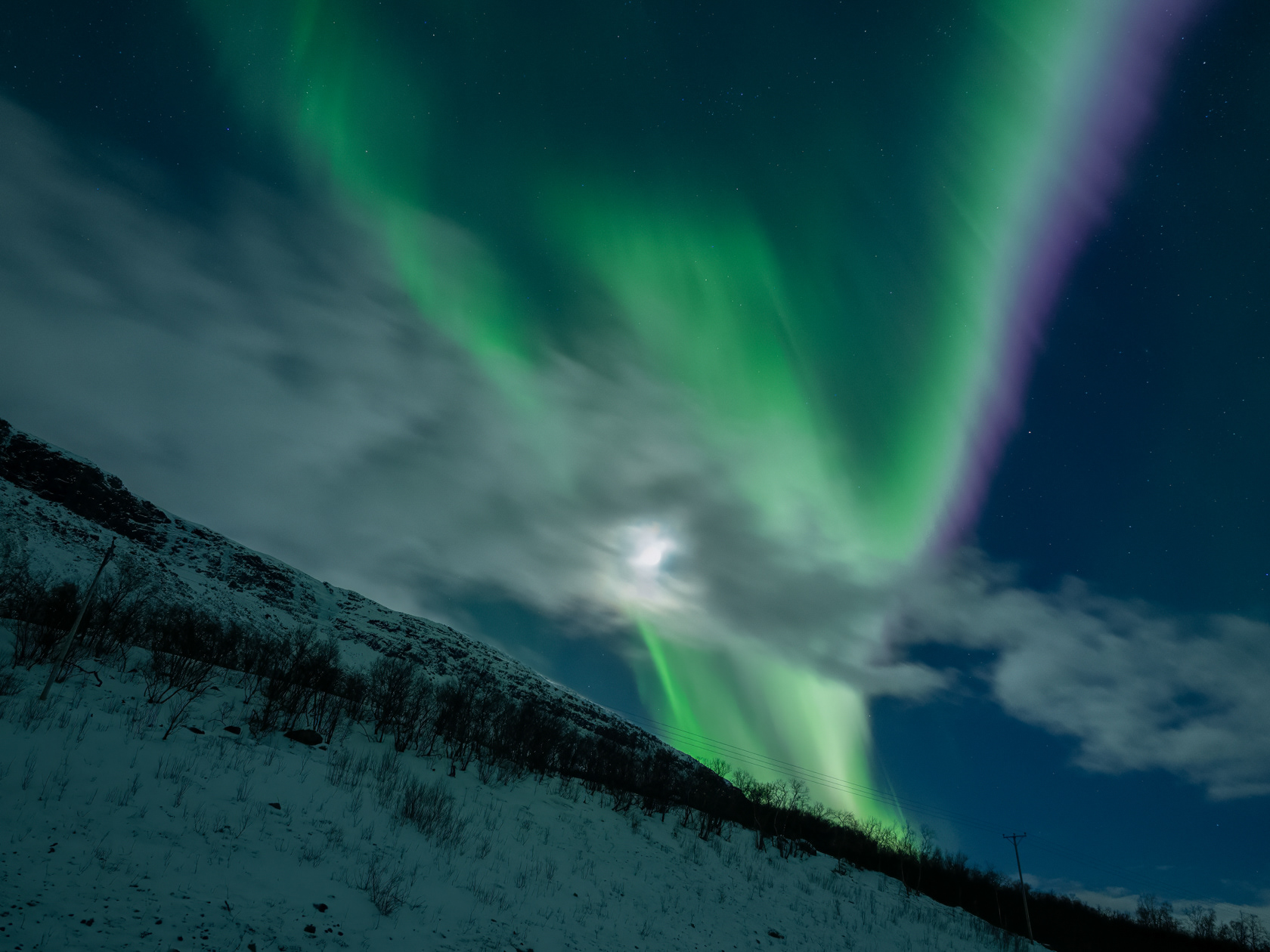 Första kvällen skulle vi fotografera norrsken men det såg svårt ut, himlen var täckt av moln, enda trösten var att månen bröt igenom ... ibland.